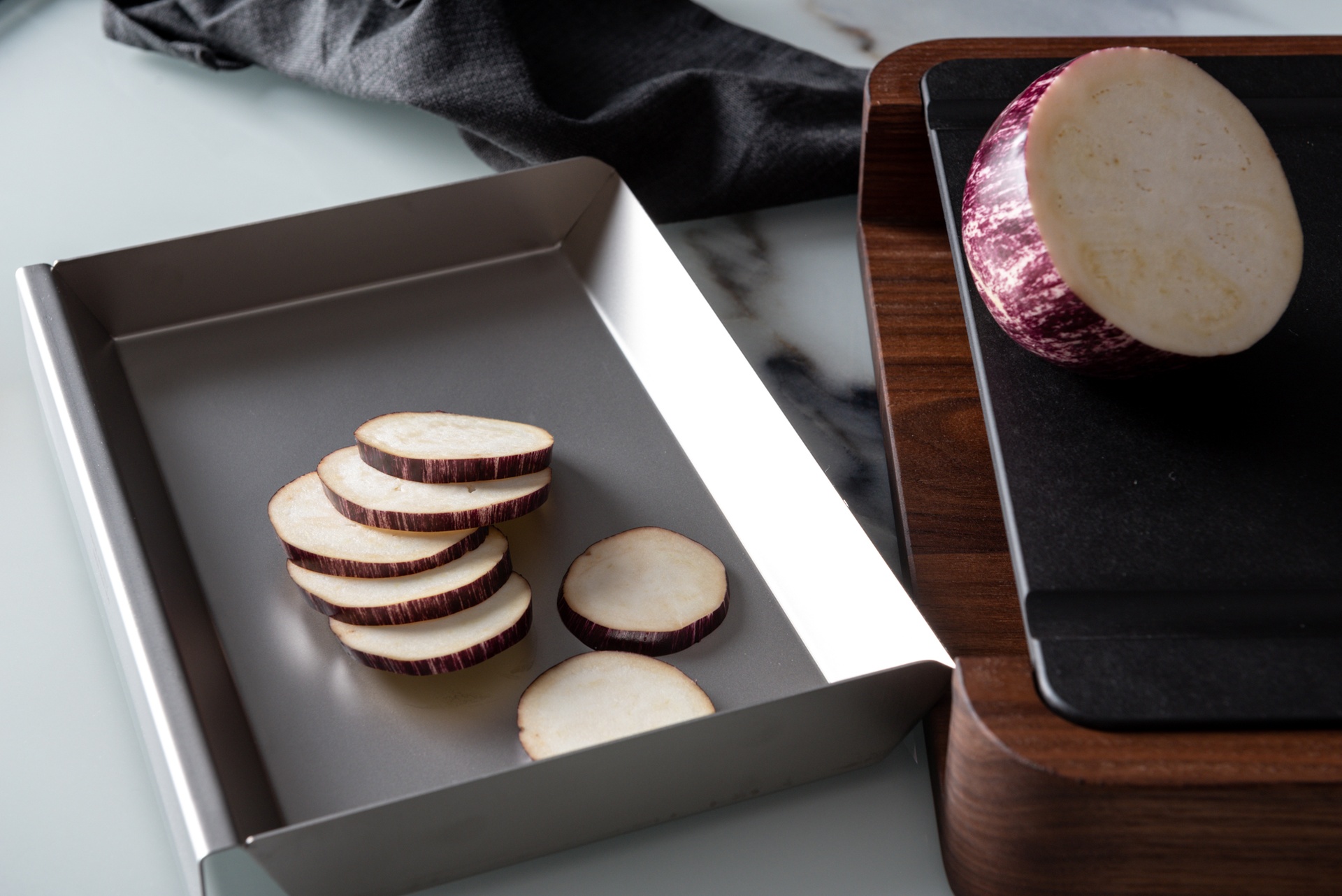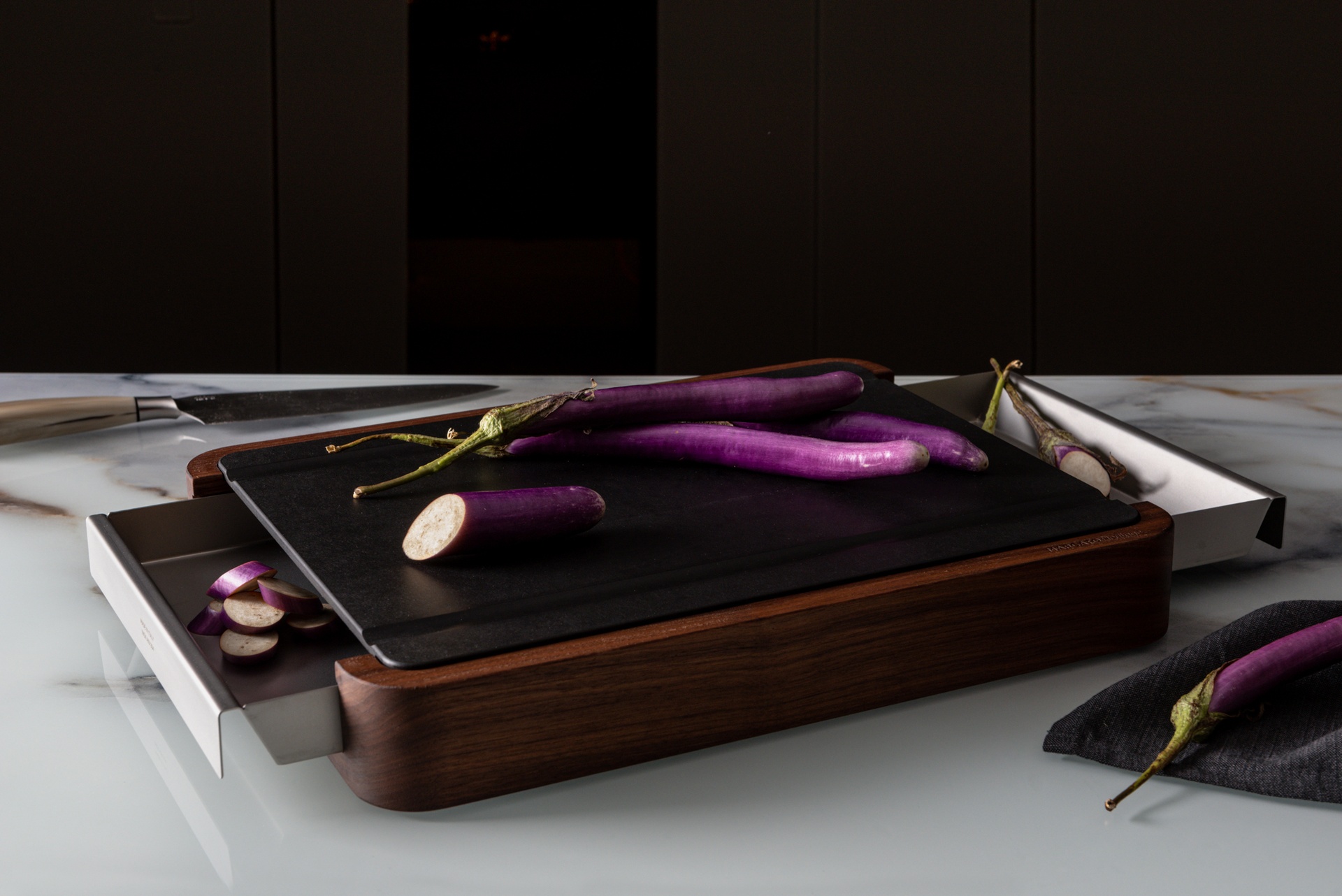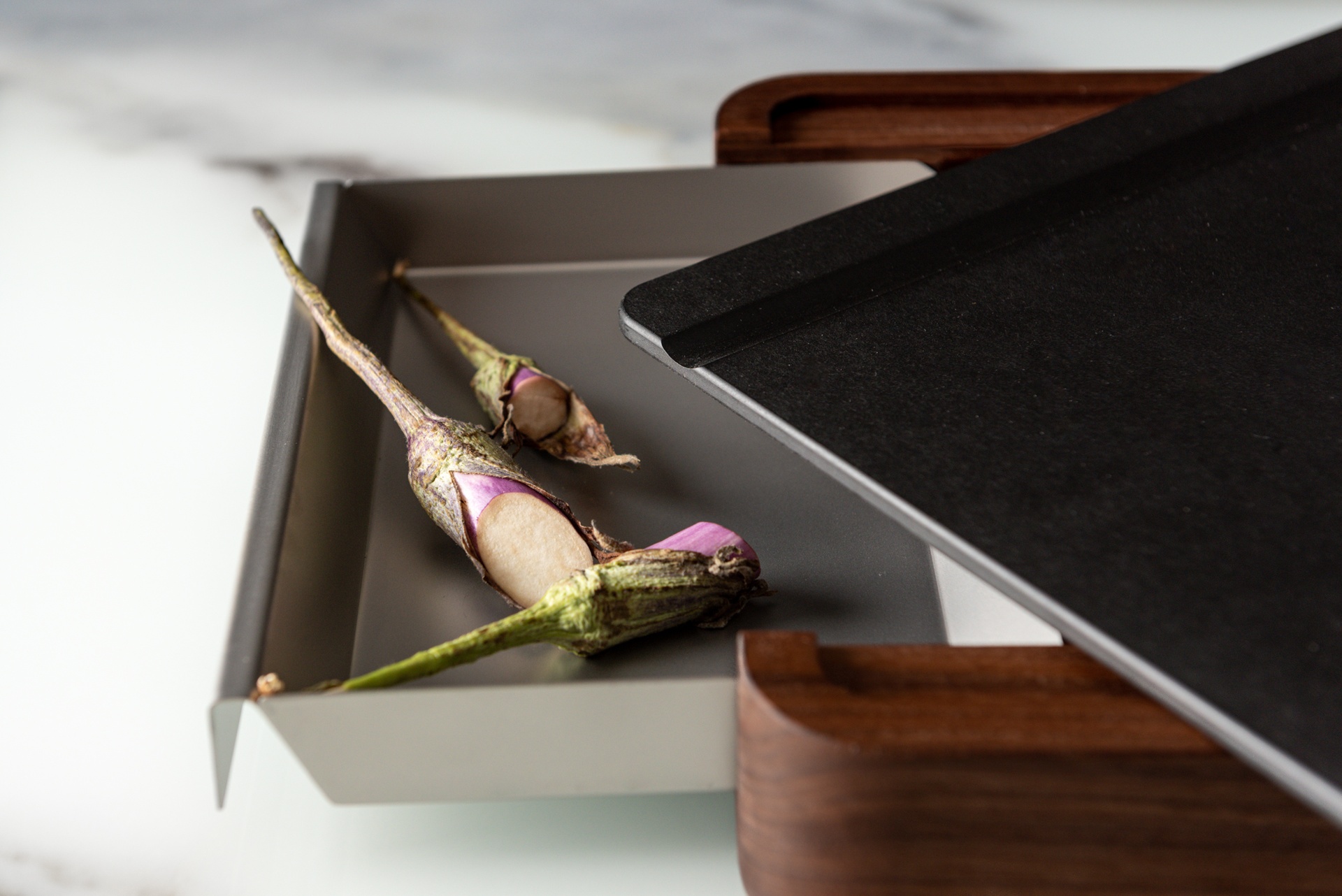 Blat de lucru ingenios care îți permite să tai, să depozitezi și să expui alimentele procesate.