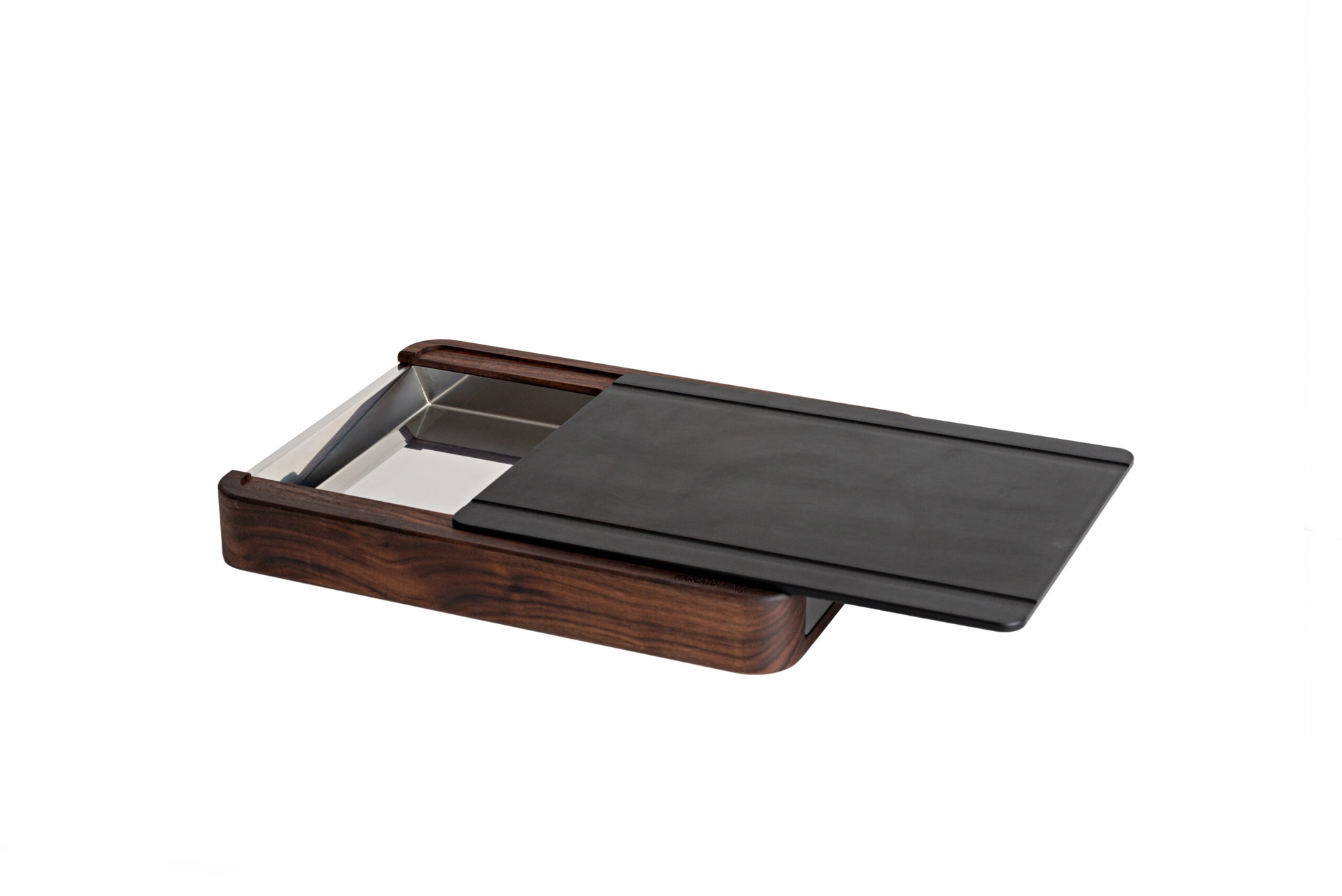 Blat de lucru cu tăvi detașabile și placă de tăiat din compozit din compozit pe bază de hârtie, tratat cu ulei protector.