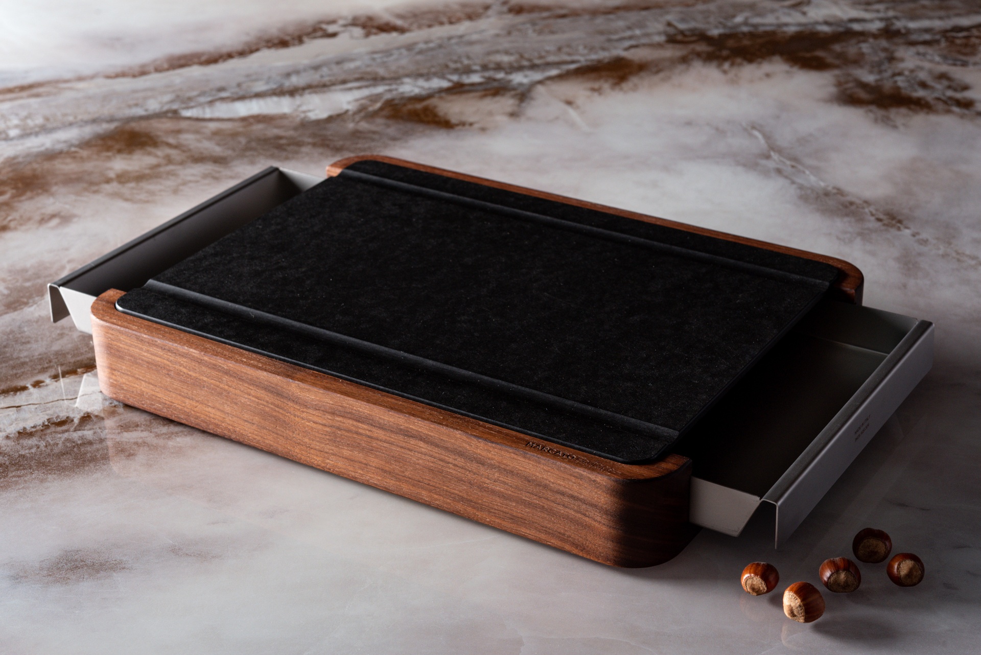 Cele trei materiale din care este realizat (nuc masiv, oțel inoxidabil și compozit pe bază de hârtie) îi conferă un design elegant, o funcționalitate practică și o rezistență excepțională.
