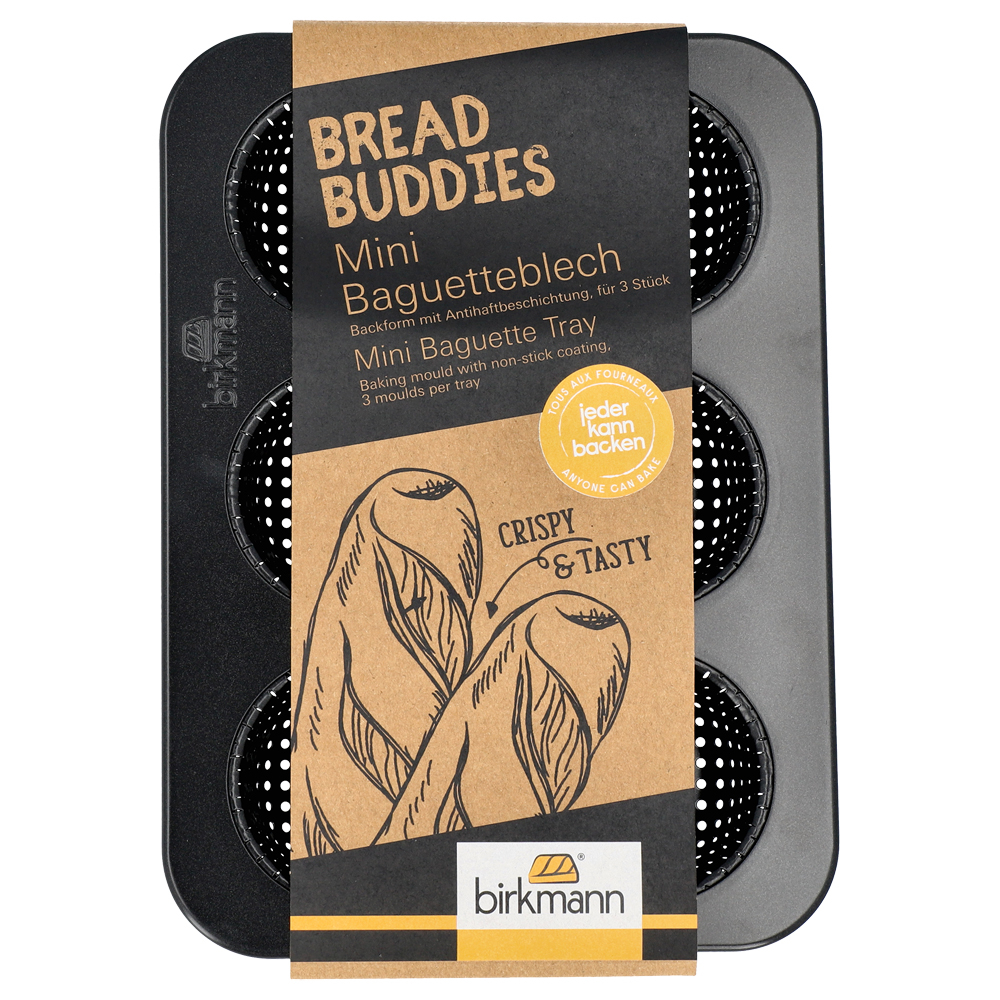 Tava cu perforatii speciale pentru mini-baghete crocante; de calitate robusta, suprafata excelenta; include reteta.